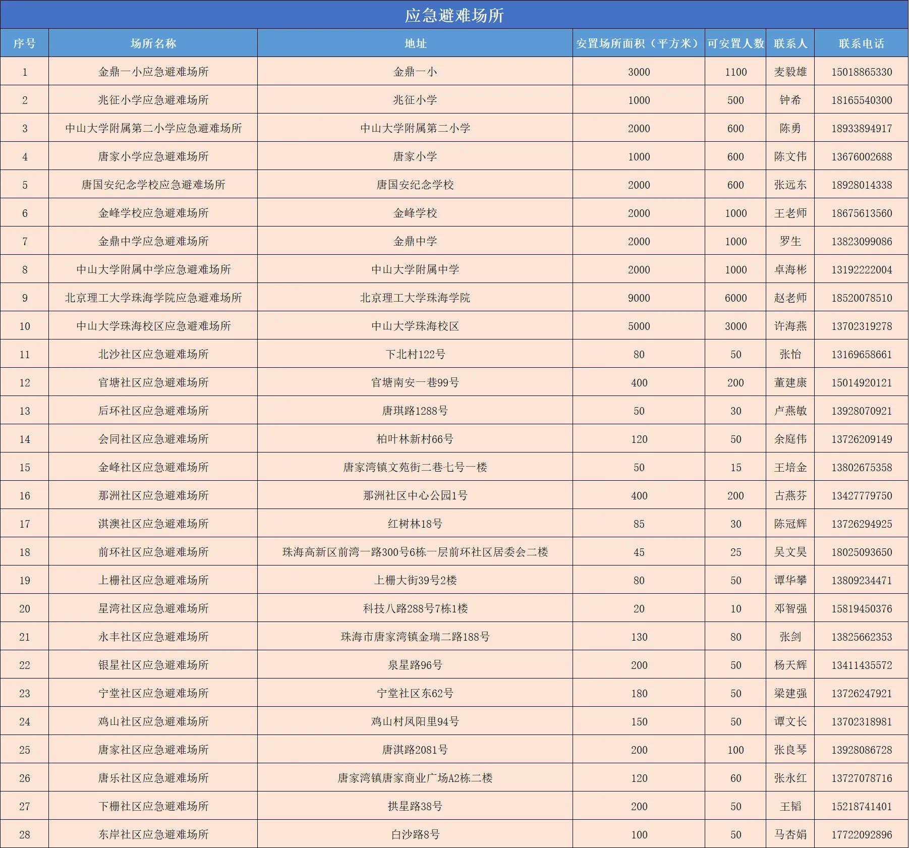 珠海各区应急避难场所信息如下: