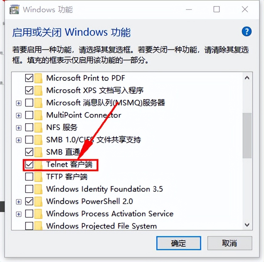 - 找到Telnet客户端,勾选确定后就开始安装了