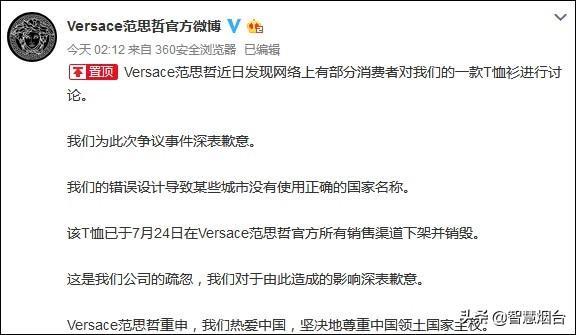 11日凌晨2点,范思哲官方微博 @ Versace 发表道歉声明,称是由于“错误设计导致某些城市没有使用正确的国家名称。”争议T恤已于7月24日在范思哲官方所有销售渠道下架并销毁。