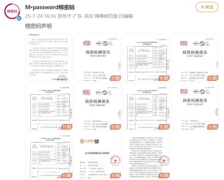 7月24日,棉密码品牌官方微博发布声明,并附上相关检测报告。