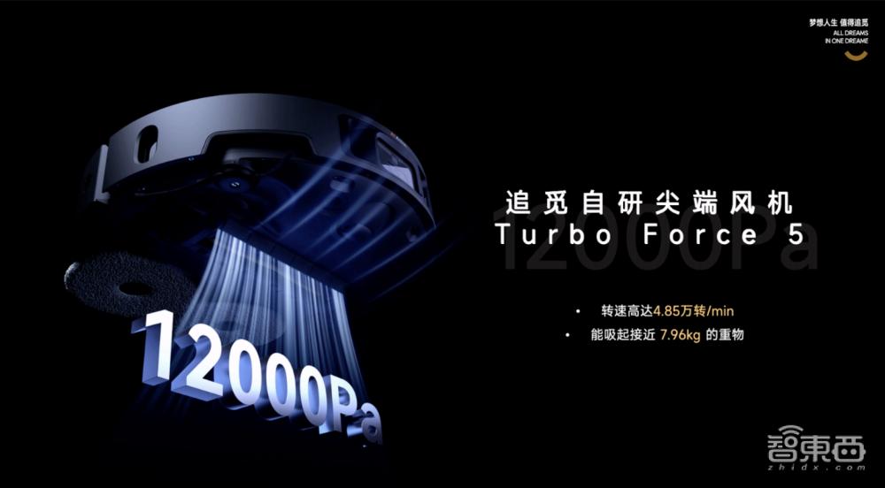 在吸力方面,X40搭载了追觅自研尖端风机Turbo Force 5,该风机转速高达4.85万转/min,能吸起接近7.96kg重物,使得X40吸力达到12000Pa。