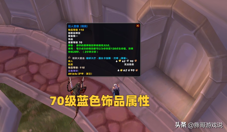 巨人塑像是TBC版本破碎大厅尾王掉落的饰品,常驻属性为32点格挡等级,使用特效为每次成功格挡都可以恢复120点血量,持续20秒,CD两分钟。