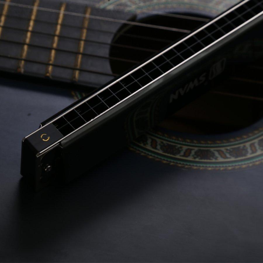 天鹅算是国内比较常见的口琴品牌,它家的琴还算物美价廉,推荐的是它家较贵的一款复音口琴,外观盖板为加厚黄铜设计,炫黑亮光处理,质感非常好。初学24孔口琴的时候经常会找不见音位,我习惯在1上唇沿位置上刻一个能被嘴唇感觉到的刻痕,这样吹奏的时候找音就非常方便了,非常适用于初学者。