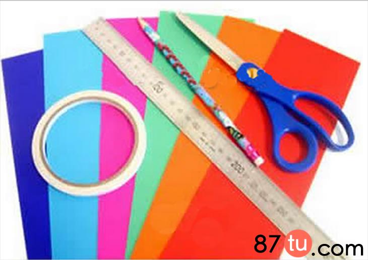 在直尺的辅助下,我们用美工刀或则是简单将彩色的纸张裁切成宽度为0.5厘米,长度为30厘米的纸条。实际上对于纸条的具体大小并没有严格的要求,唯一有要求的地方就是需要裁切的纸条在宽度上和在长度上是一致的,这样最终之作出来的纸编小球才更加的均匀和漂亮。而纸条颜色的组合也没有明确的要求,只需要根据自己喜欢的样式进行组合就可以了。