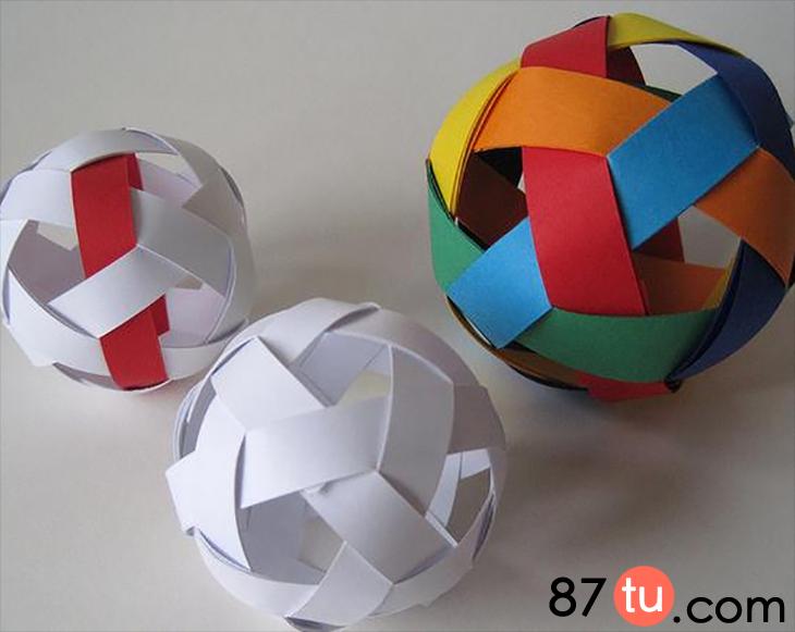 最终顺着每个纸条的势将其进行环绕,同时注意这些纸条的环绕本身也是相互压叠的,压叠的层次和下方压叠的层次都是一样的,所以只需要顺次进行压叠即可。然后将每个纸条的端头和其末端用双面胶或者是白乳胶进行粘贴即可。这样在纸条本身弹性的基础上,我们就获得了如图所示的纸编圆球结构。而这样独特的纸编圆球结构就非常适合于使用到圣诞树的装饰中,如果你没有准备圣诞树也没有关系,这个纸编小球还可以挂到居室中当做是居室的小吊饰,同样有着极好的居室装饰效果。