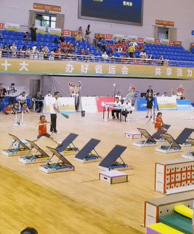 据第二十届江苏省省运会少儿体适能单项竞委会副总裁判长周俊介绍,跑酷项目加入了很多体操元素,加入了空翻和炫技动作,“4岁到12岁之间的跑酷,我们根据跑步极限运动进行了改良,把一些危险的动作去掉,以障碍跑为主要形式,让他们以一种竞速的方式,锻炼身体的爆发力、协同力等”。