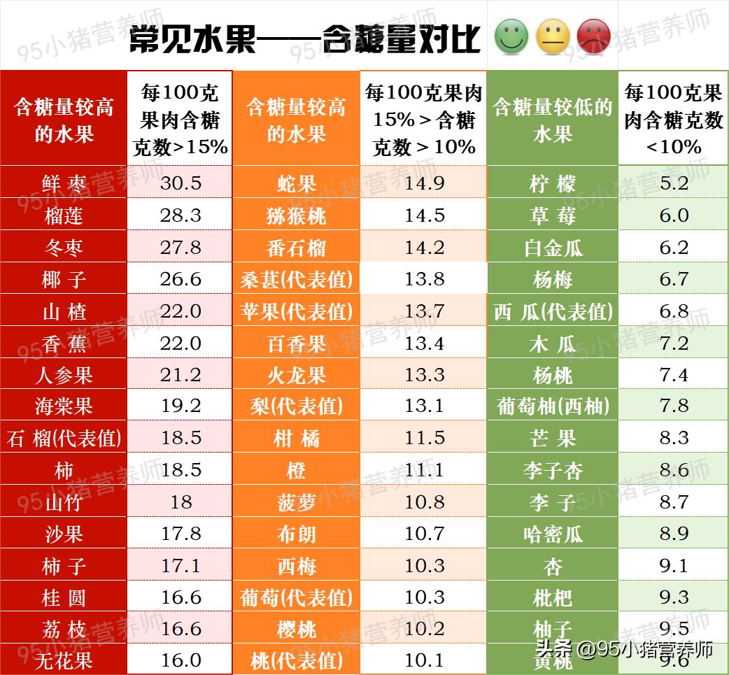 - 黄色区域:15%>水果含糖≥10%。属于含糖量稍高的水果,建议三高及减肥期的人群日常要少吃,每次切勿吃多;
