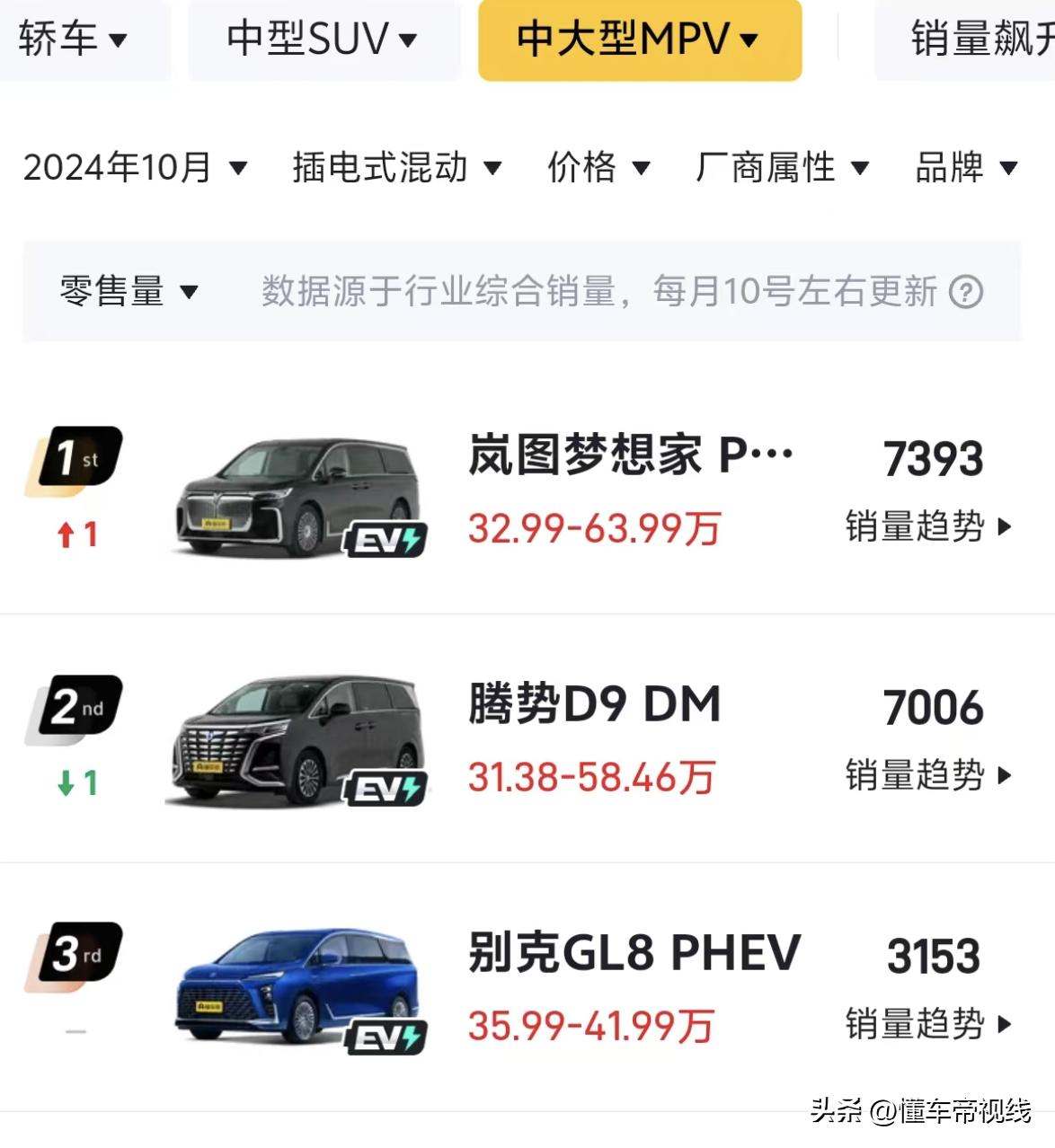 在插电混动中大型MPV细分市场,与别克GL8陆尊PHEV处于同级的竞品车型包括腾势D9 DM(指导价33.98万-60.06万元)、岚图梦想家PHEV(指导价32.99万-63.99万元)、传祺E9 PHEV(指导价31.98万-40.98万元)等车型。销量方面,别克GL8 PHEV 10月销量为3153辆,位列当月插电混动中大型MPV销量榜第3位。有关别克品牌的更多消息,我们将持续关注。