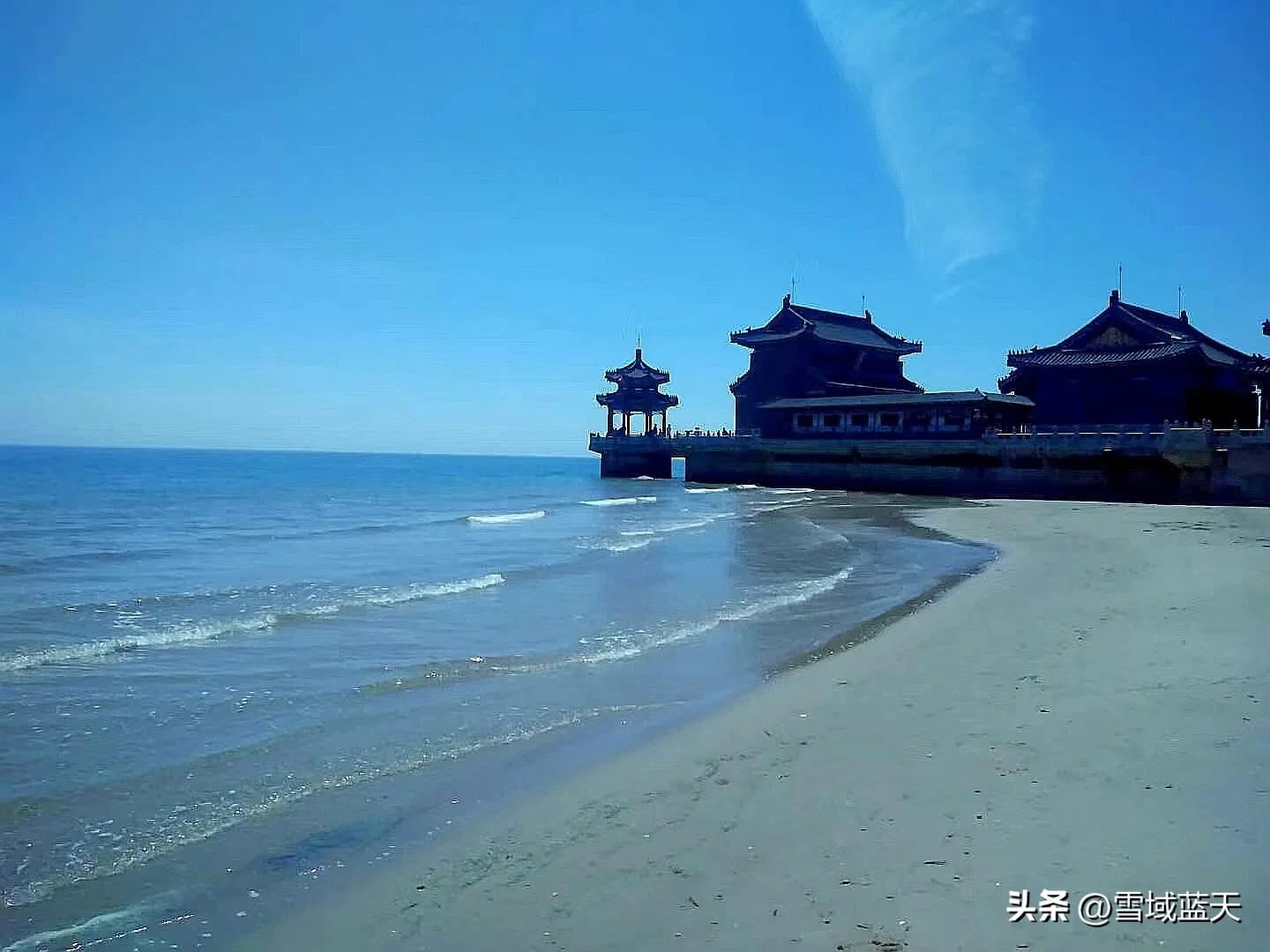 正中间是求仙庙很高,里面是全息影院有播放时间,额外收费的,求仙庙正对着是求仙路,路是下坡的,两侧有古代大臣的石像,中间是秦始皇的石像,面对着大海,这个海边有一个栈桥类似青岛栈桥,这个栈桥只有坐船买票才能上去,我就在下面的海滩走一走,海滩还是很干净的,南侧有一个灯塔标志,