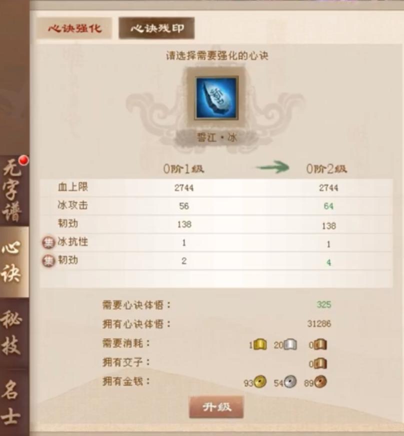 上图中枕戈的是5阶(满级)的,刚获取的心诀是0阶的,心诀升级需要消耗交子和心诀体悟,升阶需要消耗交子和心决残印。阶数和级数越高,给角色带来的属性提升也越高。