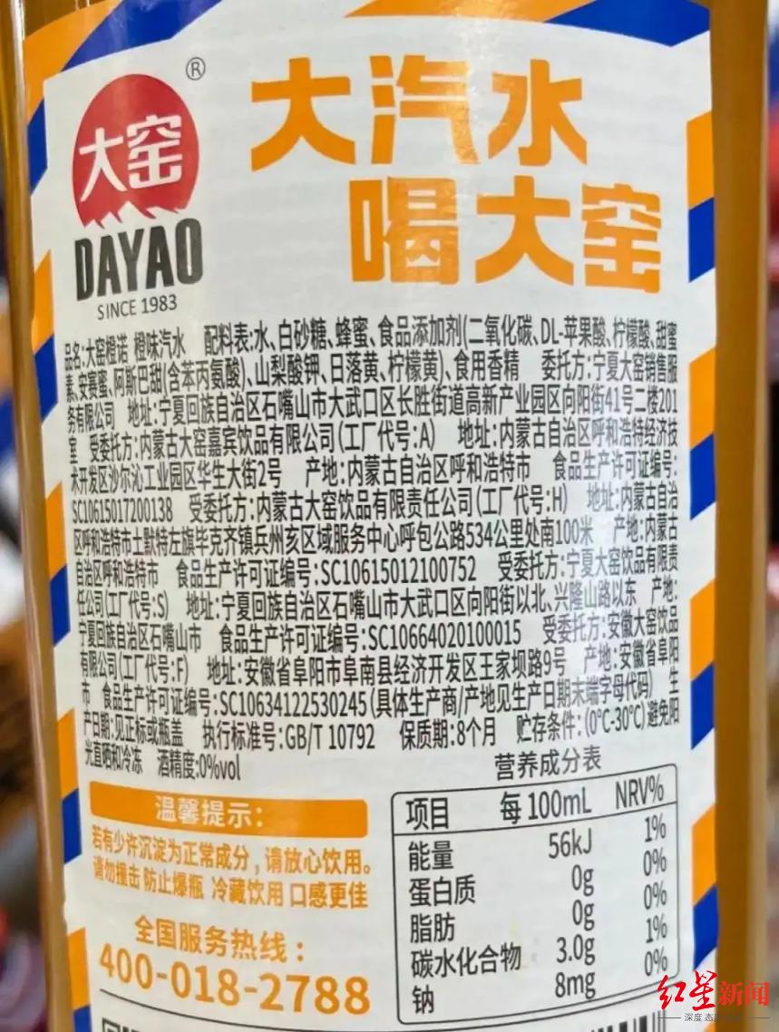 大窑汽水复杂的配料表引人注目,也招致很多消费者吐槽。以大窑橙味汽水为例,其配料为:水、白砂糖、蜂蜜、食品添加剂【二氧化碳、DL-苹果酸、柠檬酸、甜蜜素、安赛蜜、阿斯巴甜(含苯丙氨酸)、山梨酸钾、日落黄、柠檬黄】、食用香精。