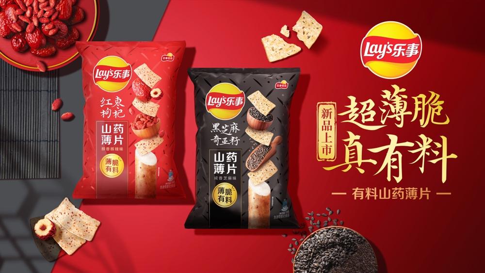 添加真实山药的乐事山药薄片基于创新的中式养生概念,推出片片真材实料的山药薄片产品。醇香核桃味添加了宁夏枸杞与沧州红枣,咸香芝麻味使用甄选黑芝麻与奇亚籽作为原料,两款口味独具东方风味,醇香有料,口感层次丰富,好吃又有料。