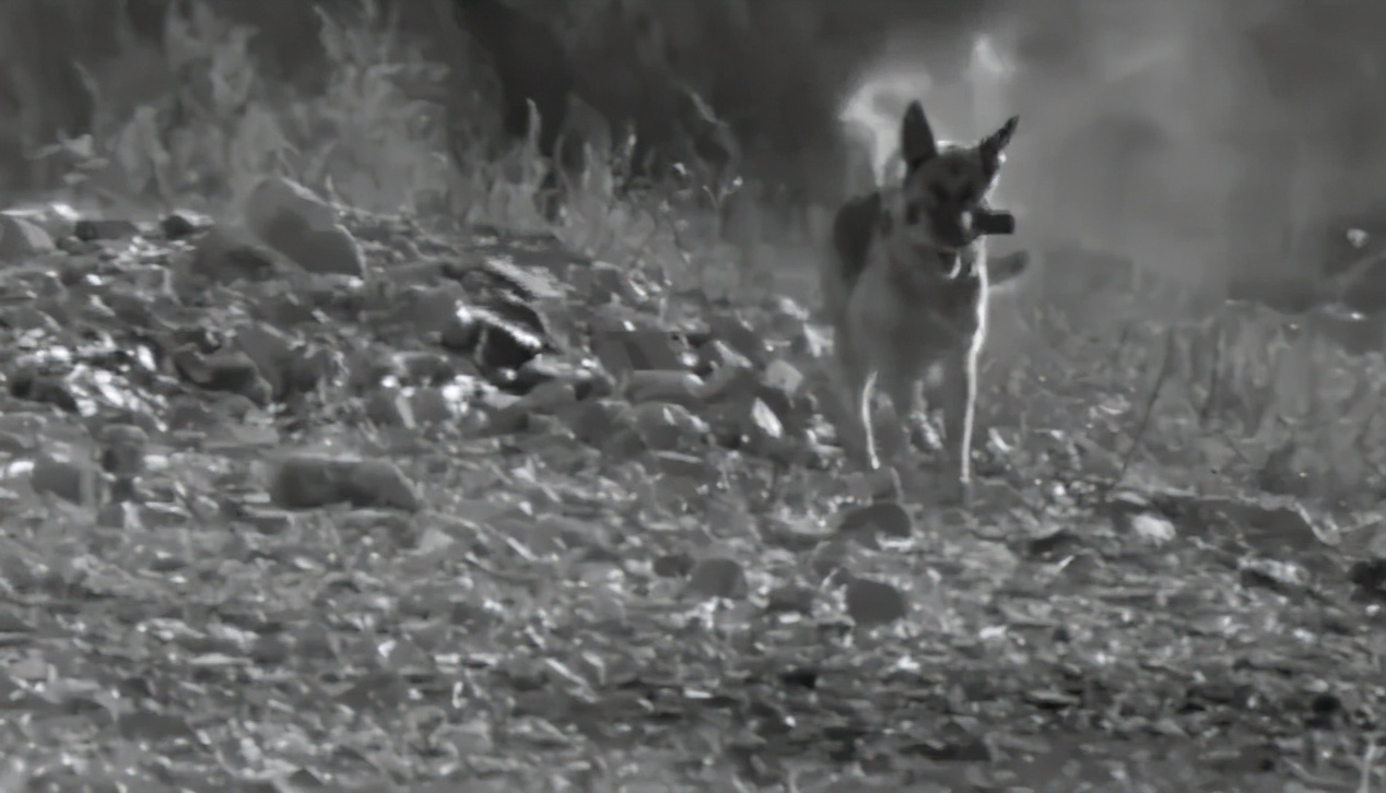 就这样,军犬叼着炸弹在镜头前被炸成了碎片……