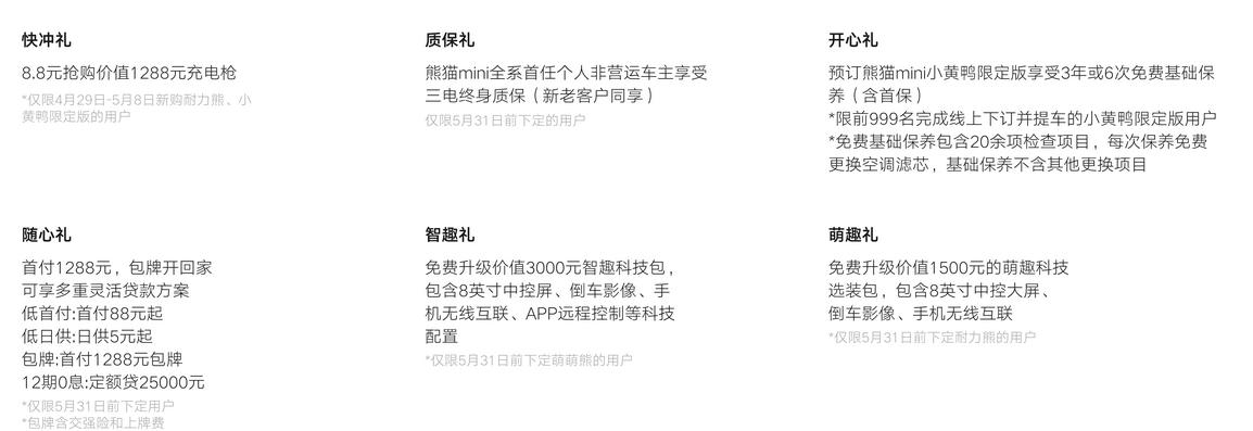 再有的就是一些比较日常需求用到的,车机、充电口,扬声器,倒车影像、智控钥匙等等的配置,在最低配的萌萌熊版本并没有。没有了中控屏车机,就车机互联的没有了乐趣,缺少倒车影像在比较狭窄的地方停车就很难更加精确的了解后车情况。在耐力熊方面8英寸的中控屏和倒车影像以及手机互联这三个功能则可以用1500元的价格在全部购买时间段进行选装。