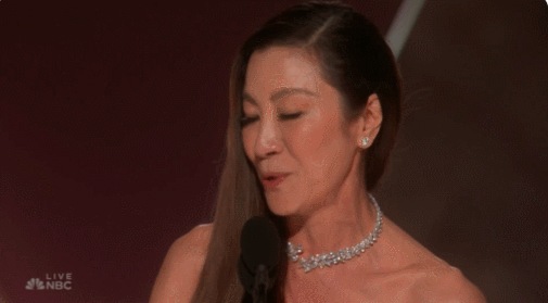在催场音乐中,杨紫琼不急不慢地继续发表获奖感言,她感谢了《瞬息全宇宙》的导演和编剧,谢谢“他们有勇气写一个非常普通的移民、亚裔、女性、母亲、女儿的故事”,还提到了这个角色对女性和移民的意义。