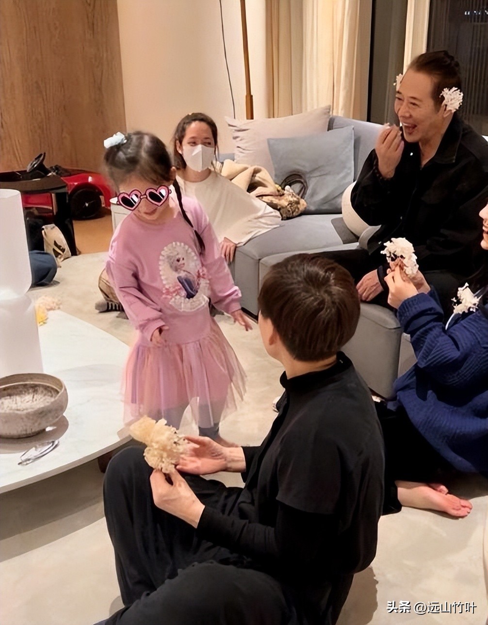 这种幸福感觉都快要冲出屏幕了,为了逗小朋友开心他还在耳朵上带了两朵花。