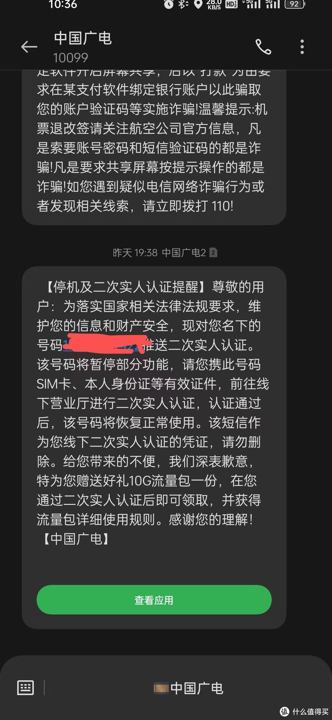 两小时左右,于下午13.50分左右,第二条二次认证的短信,不期而至。期间我只拨打了10099广电客服电话,询问过资费问题。