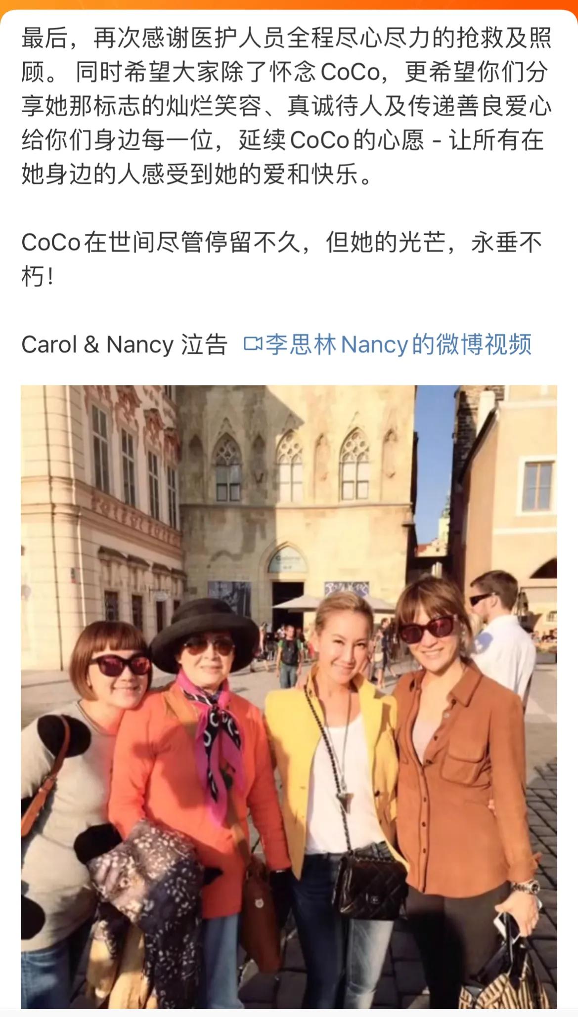 2023年7月5日晚上,李玟姐姐在社交媒体上透露李玟因患抑郁症,于7月2日在家中自杀,被家人发现时已昏迷不醒,紧急送往医院进行抢救,最后抢救无效,于7月5日与世长辞。
