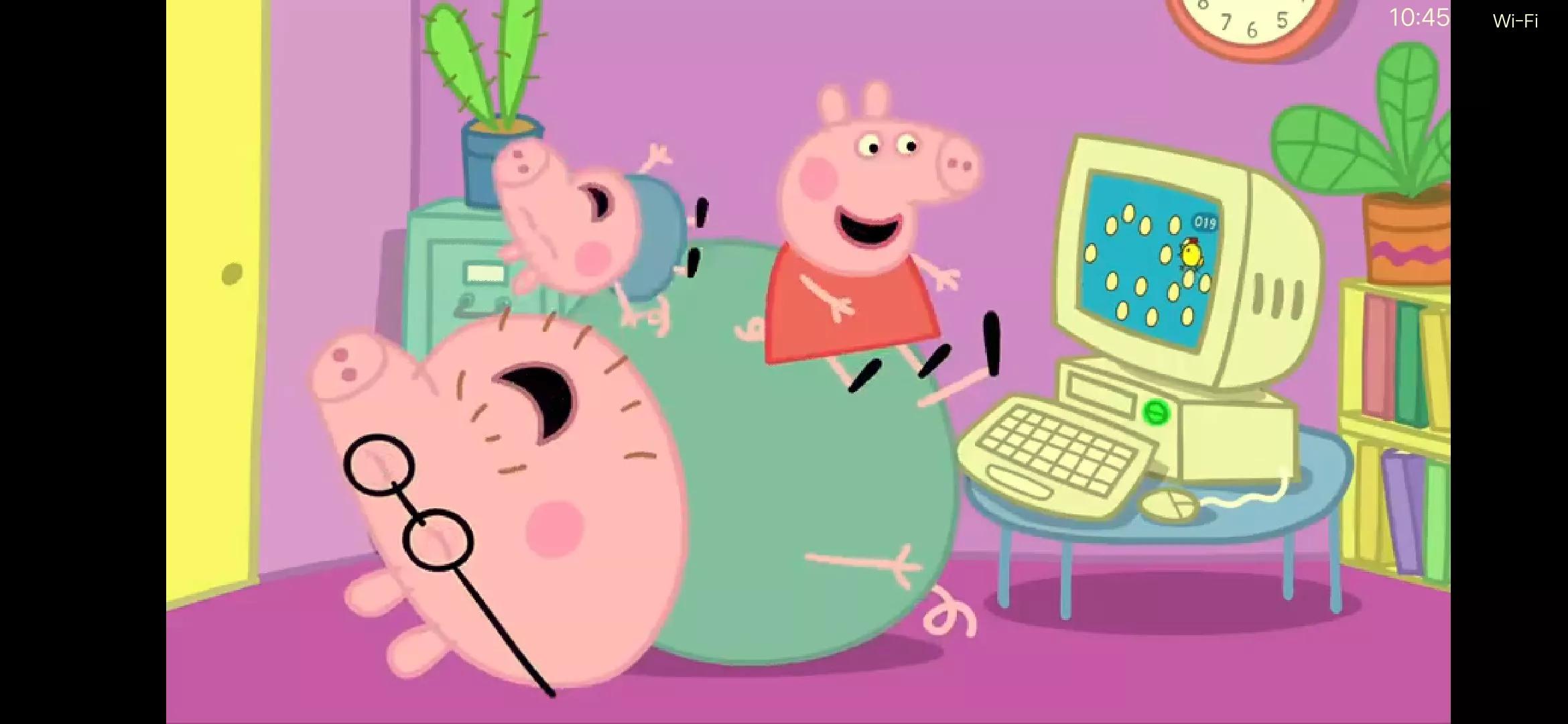 比如,游戏中间这集。佩奇不给乔治玩皮球,乔治太小也捧不起来,猪妈妈就在中间调停,让姐弟俩通过自己传球,结果乔治扔不上去,就带着球从妈妈的腿中间钻过去。是不是挺惊喜?