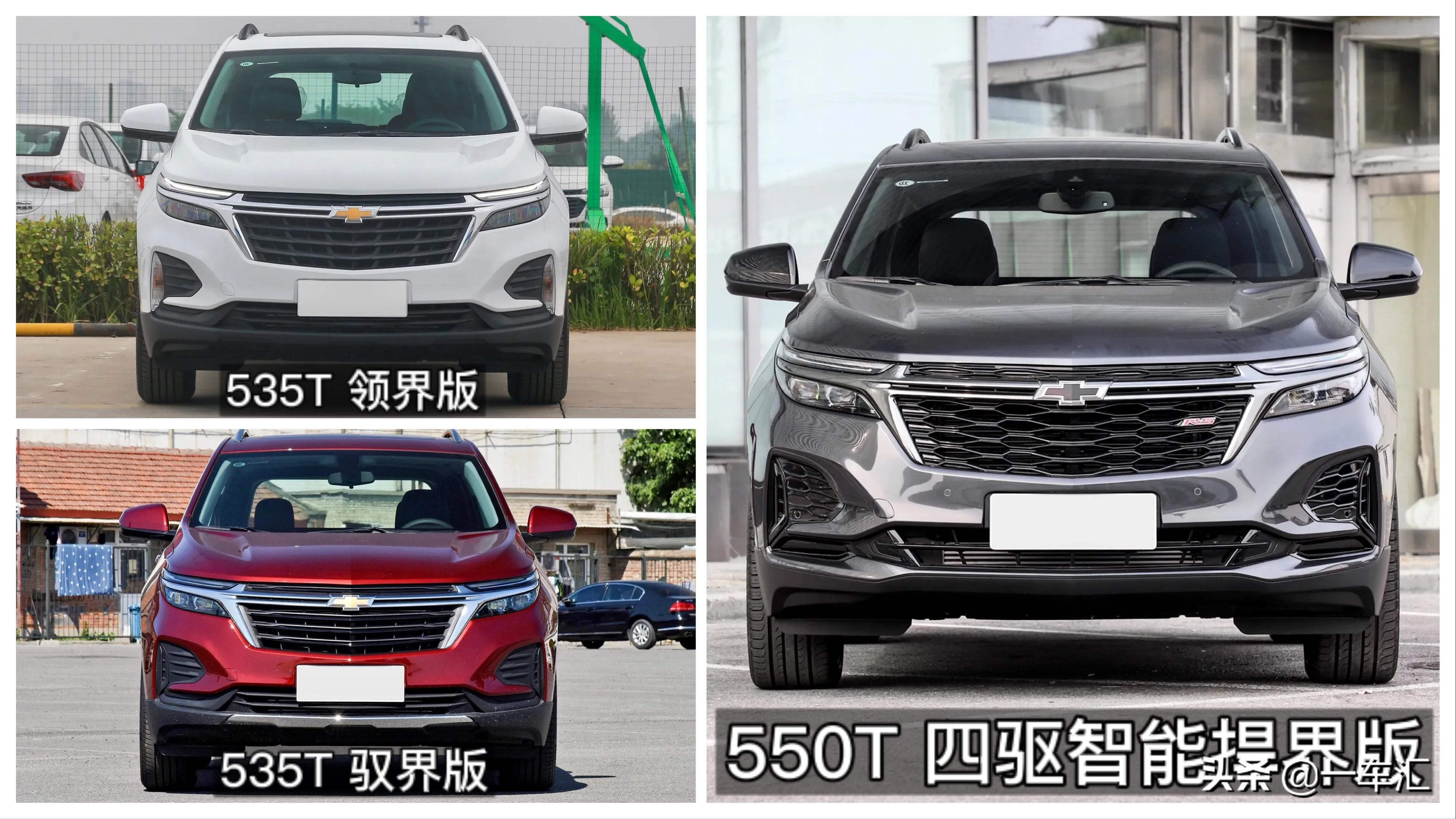 外观方面,雪佛兰探界者相比同平台的别克昂科威,在设计层面更倾向于美式风格,中期改款主要变化集中在车头和车尾等处,虽谈不上大刀阔斧的改造,不过依然和之前有着明显的区别,尤其是550T车型在采用了RS套件之后,增加了细节处的黑化处理,视觉效果运动激进。车系中的535T车型整体更偏向居家实用,高配535T 驭界版相比其它两款入门版本,在车身外部多了一些镀铬装饰,而且由于配置不同,在大灯样式上也有区别。至于三款550T车型的区别,则仅表现在智能拓界版采用了比其它两款小一号的轮毂。