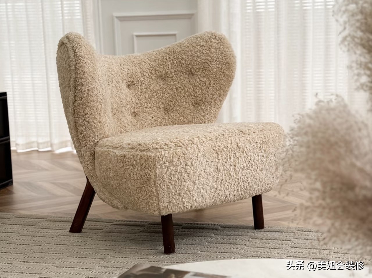 平替:高脚羊羔绒单椅是豆袋懒人沙发的理想平替,它能够很好地承托腰臀,提供舒适的坐感,同时羊羔绒的材质柔软舒适,好打理,而且高脚的设计也让空间看起来更加轻盈。