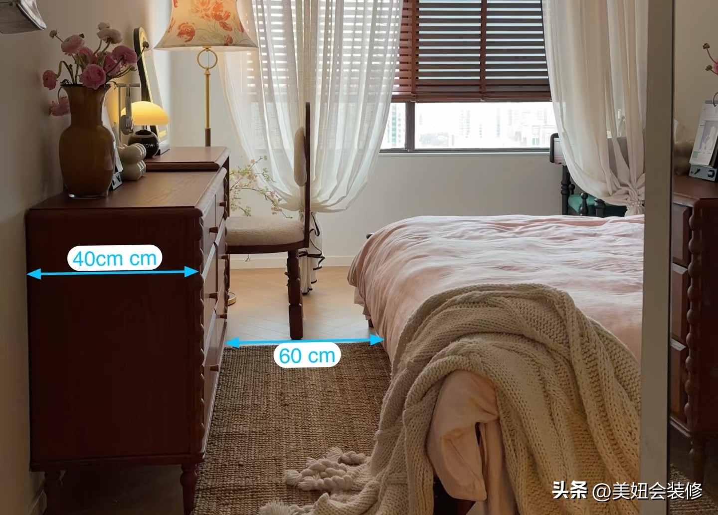 对于卧室来说,床两侧的过道应至少保留 60cm 的宽度,否则在开门或行走时容易撞到柜子,影响使用的便利性和安全性。