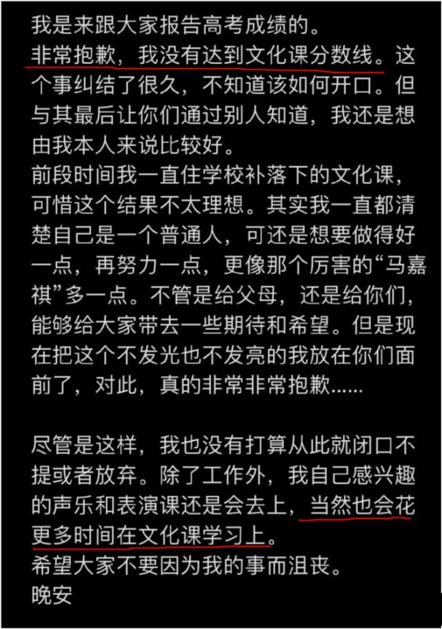 日前,时代少年团成员马嘉祺为高考落榜没有达到文化课分数线一事亲自发文致歉。