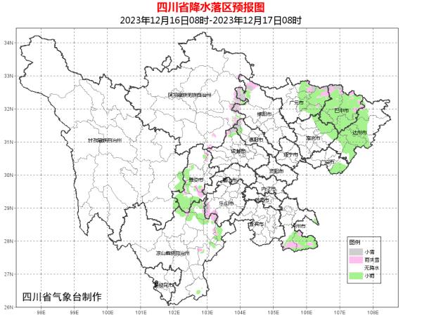 17日白天到晚上:盆地大部多云间阴,其中广元、巴中2市和达州北部、乐山南部及西部山区有小雨,盆周高海拔地区有雨夹雪或小雪;川西高原和攀西地区大部以多云间晴天气为主,阿坝州北部和甘孜州西北部有阵雪(雨)。
