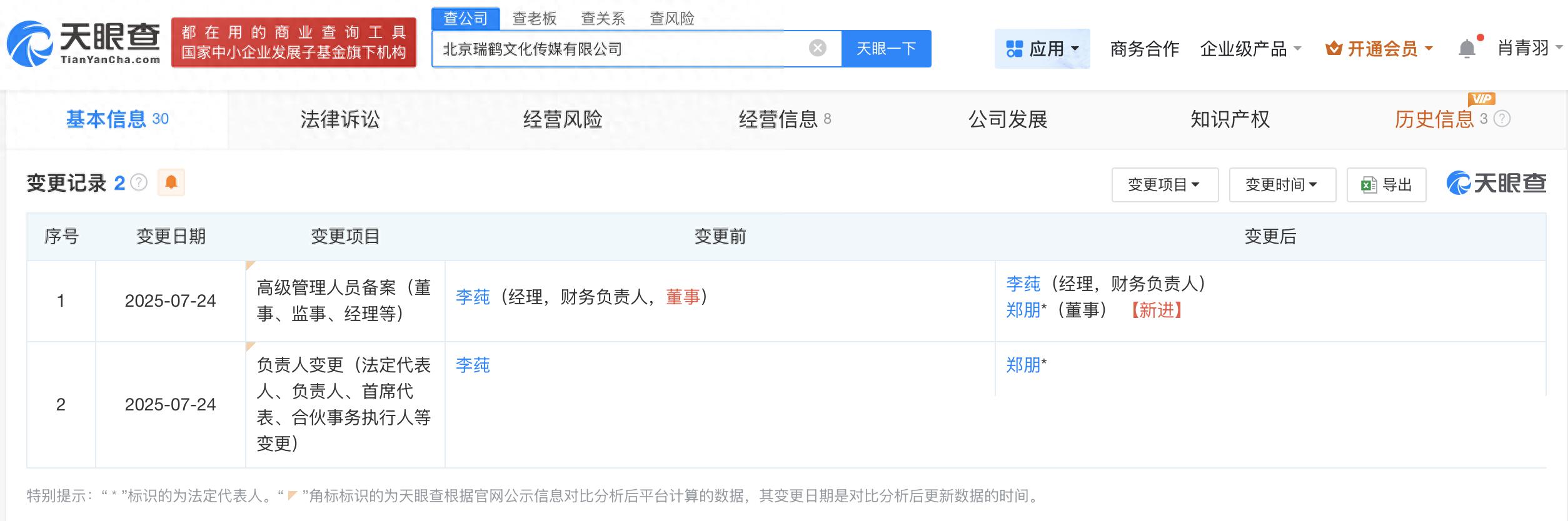 天眼查App显示,近日,北京瑞鹤文化传媒有限公司发生工商变更,李莼卸任法定代表人、董事,均由郑朋(梓渝)接任。北京瑞鹤文化传媒有限公司成立于2024年9月,注册资本10万人民币,经营范围包括票务代理服务、其他文化艺术经纪代理、礼仪服务、文化娱乐经纪人服务等。股东信息显示,该公司由李莼全资持股。