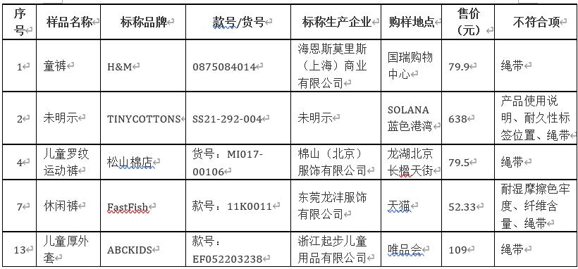 试验结果显示,其中,标称品牌为H&M,货号为0875084014,售价为79.9,其标称生产企业为海恩斯莫里斯(上海)商业有限公司的童裤,不符合项为“绳带”。