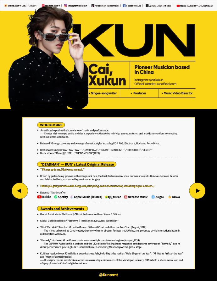 2025年5月28日,蔡徐坤发了新歌《Deadman》。这首歌曲融合复古灵魂乐与先锋摇滚。最关键的是什么呢,无论是歌曲的制作,好听程度,还是蔡徐坤的演唱,都超越了一般爱豆的评价,说人话就是表现确实不错。