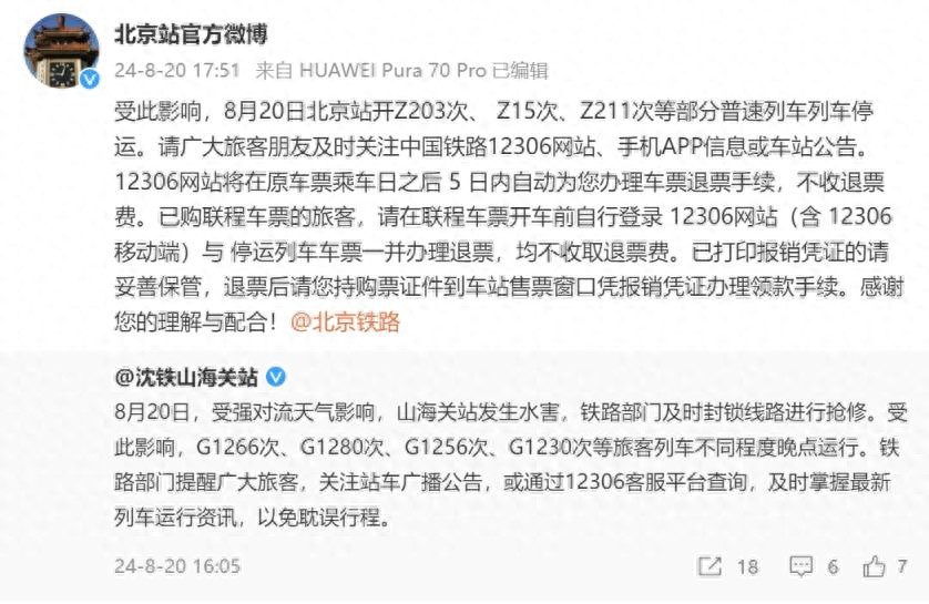 据北京站官方微博,受此影响,8月20日北京站开Z203次、Z15次、Z211次等部分普速列车列车停运。请广大旅客朋友及时关注中国铁路12306网站、手机APP信息或车站公告。12306网站将在原车票乘车日之后5日内自动为您办理车票退票手续,不收退票费。已购联程车票的旅客,请在联程车票开车前自行登录12306网站(含12306移动端)与停运列车车票一并办理退票,均不收取退票费。已打印报销凭证的请妥善保管,退票后请您持购票证件到车站售票窗口凭报销凭证办理领款手续。感谢您的理解与配合!