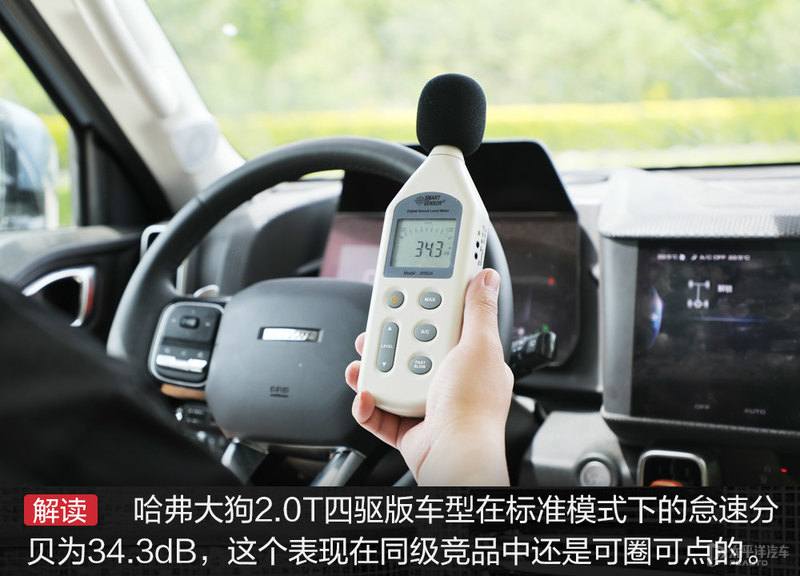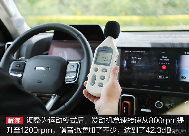 而将驾驶模式调整为运动模式后,,发动机转速提升至1200rpm/min,此时噪音仪的分贝显示达到了42.3dB,在车内可以明显感觉到发动机的轰鸣声存在,不过这样的成绩还不足以影响车内乘客的语言沟通,并且在开起来后反而会减少一些。