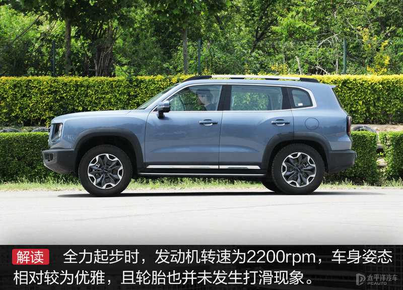测试当天北京气温20.5℃,关闭空调及车身稳定控制系统并调至运动模式后,发动机怠速转速由800rpm/min提升至1200rpm/min。全力起步时,转速最高达到了2200rpm/min,车轮并未出现打滑现象,且起步姿态以SUV车型的标准来说较为优雅,最终以3挡破百,测得百公里加速成绩为8.8s。