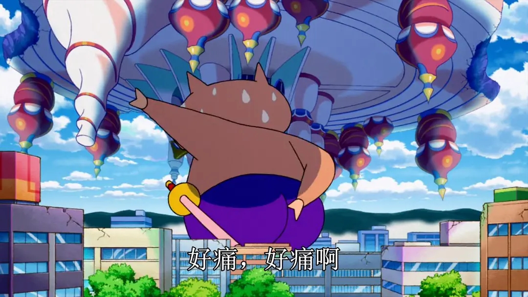 肥嘟嘟左卫门凭借一己之力,举托巨大的飞艇,帮助小新他们逃出生天。