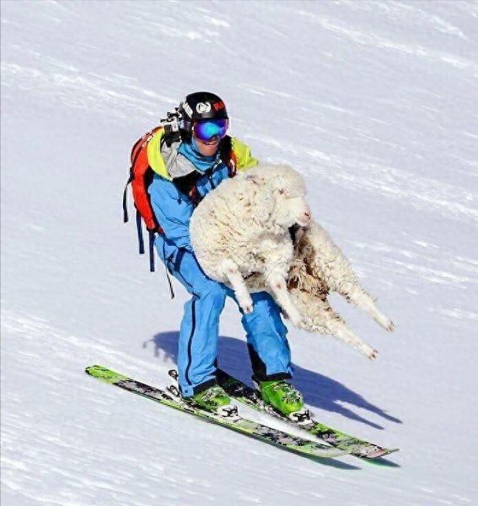 1、滑雪者抱着一只羊,这只羊会终身难忘吧。