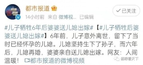 11月18日,110多家新媒体在社交平台转发@都市报道的一条视频,文案是儿子牺牲6年后婆婆送儿媳出嫁。