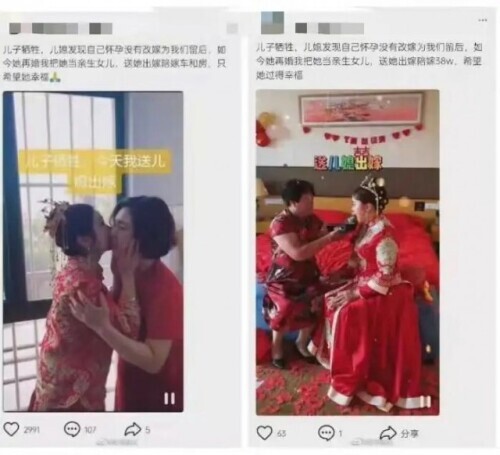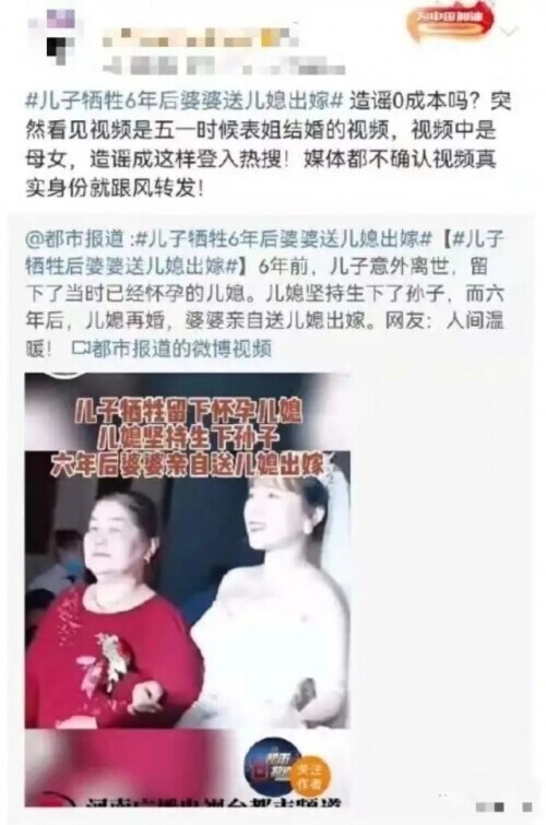 多年来,各路营销号在不同地方、不同时间,以“某家的儿子意外离世,留下了当时已经怀孕的儿媳。儿媳坚持生下了孙子,而多年以后,儿媳再婚,婆婆亲自送儿媳出嫁”的雷同文案,配以婚礼视频,博人眼球赚取流量。
