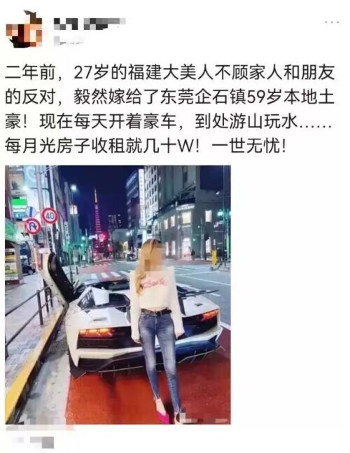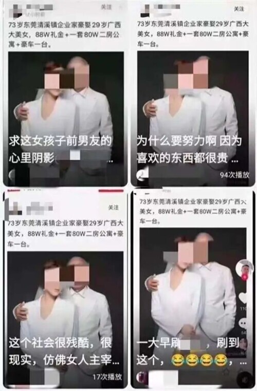 就在“婆婆送嫁儿媳”谣言发生的第二天,11月19日,一个叫“飞哥在东莞”的账号,在某平台发文称“73岁企业家豪娶29岁美女”。