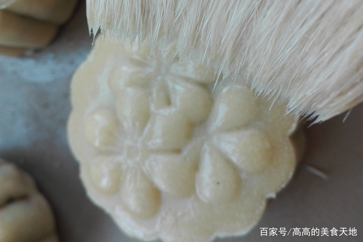 14、在从烤箱烤好的月饼胚拿出来,在其表面轻轻的刷上一层非常薄,非常薄的蛋黄液,重要事情说三遍,一定要非常薄薄的一层即可,不然烤制出来的颜色太重,影响外观,如图所示。