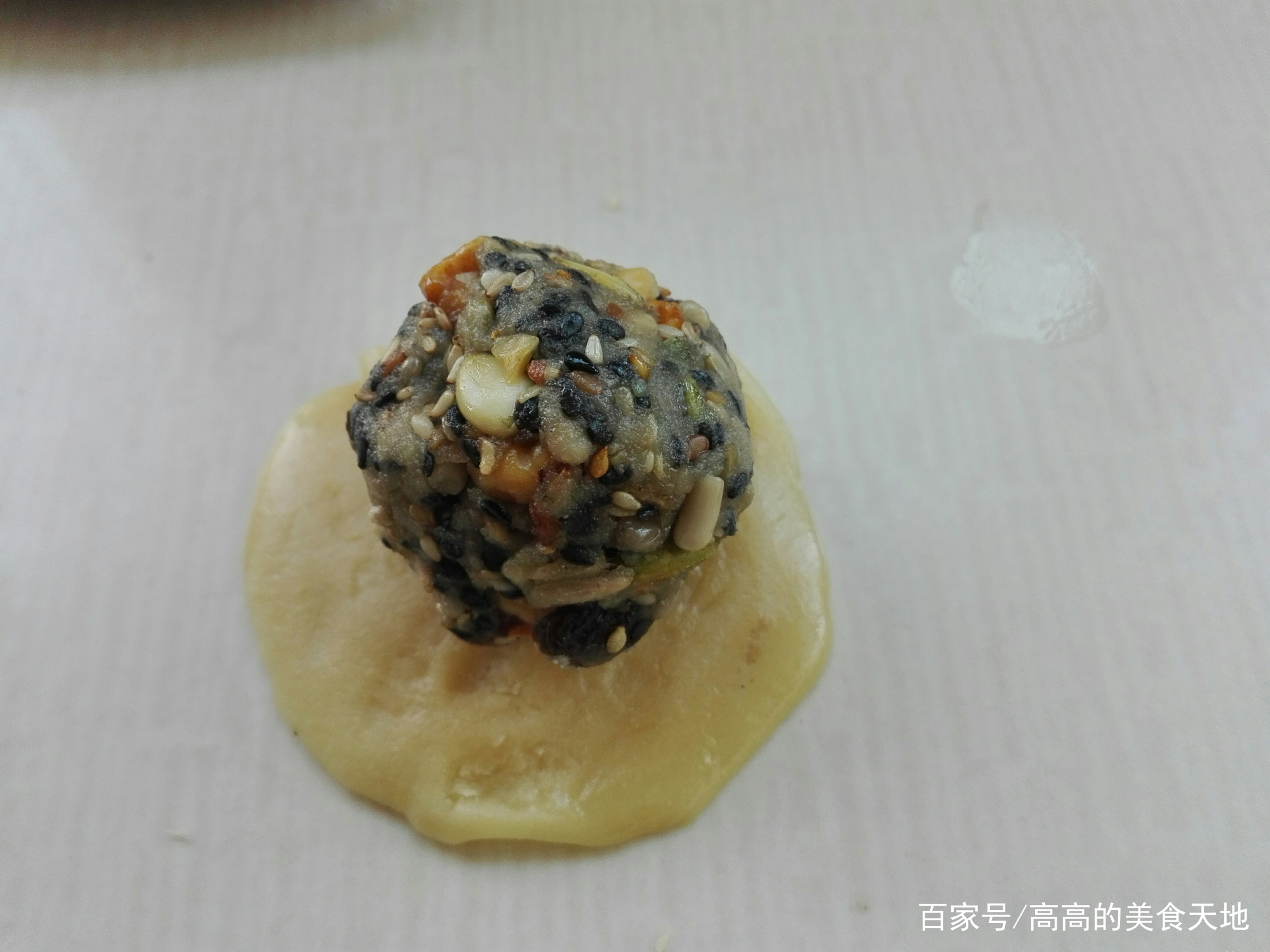 8、接下来就是开始进行包制部分的操作了,整个操作同样是戴好食品用硅胶手套,这样会不粘手,更好操作,将将分好的饼皮直接在手上按压成薄的饼皮,因为饼皮部分的面团非常软,所以直接用手掌进行按压就可以,然后将分好的馅料部分放入按压好的饼皮上,如图所示。最后就是用虎口收缩的方式,慢慢将饼皮滴着馅料推上去,包裹好即可。