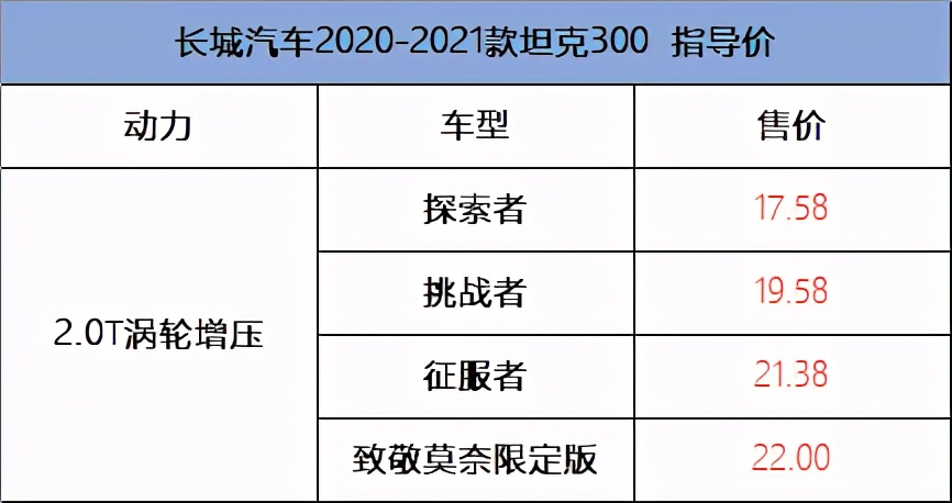 坦克300目前在售车型共有4款,指导价在17.58-22.00万之间,其中致敬莫奈限定版为2021年推出的新款。