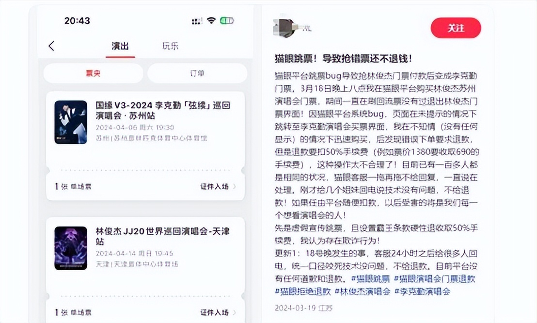 此前,猫眼演出也出现系统bug,想买“林俊杰”,下单变成“李克勤”!再想退订单,却要收50%的手续费。去年3月,南京魏女士在猫眼上买票就遇到了这样的糟心事。
