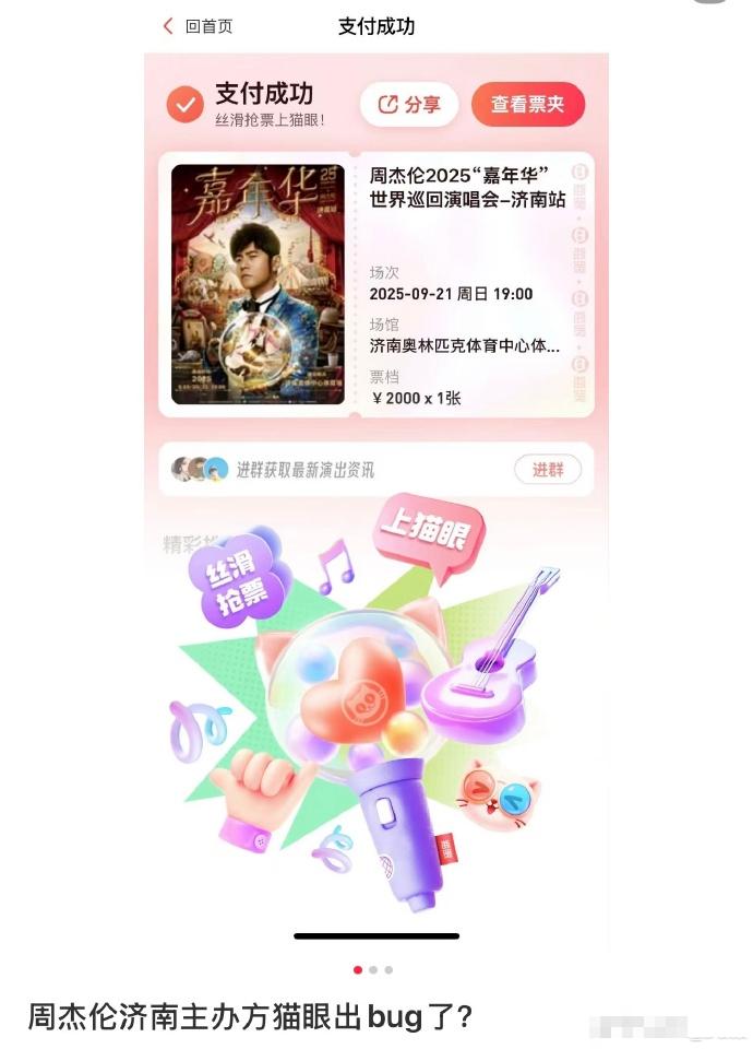 2025年7月1日22:19-22:31期间,猫眼平台无预告释放周杰伦济南演唱会(9月20日场次)大量门票,多用户成功支付购票。用户反馈:部分用户通过社交平台传播消息后抢票成功,最高单笔订单超2000元。部分用户还订好了酒店车票。