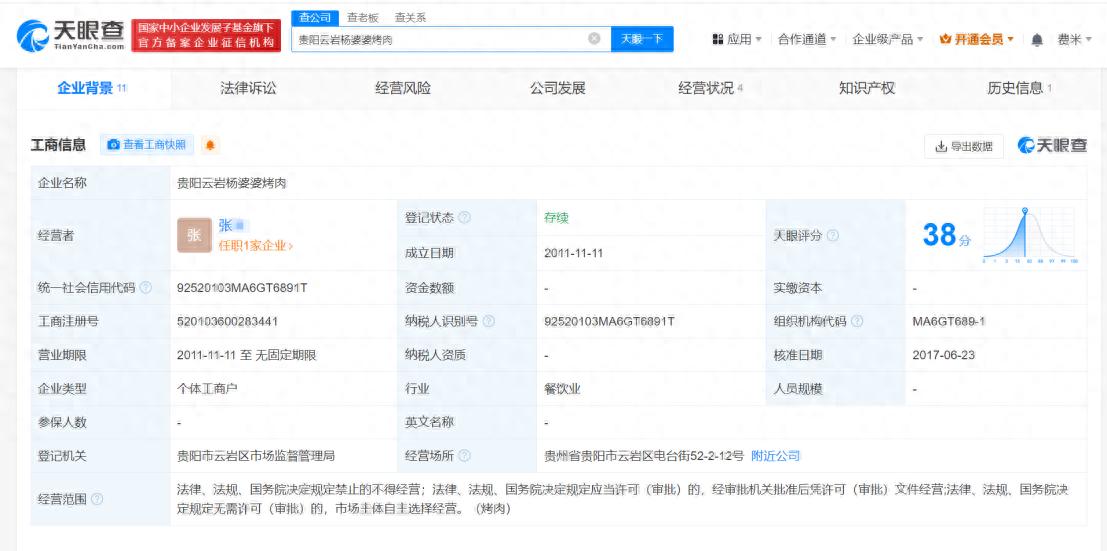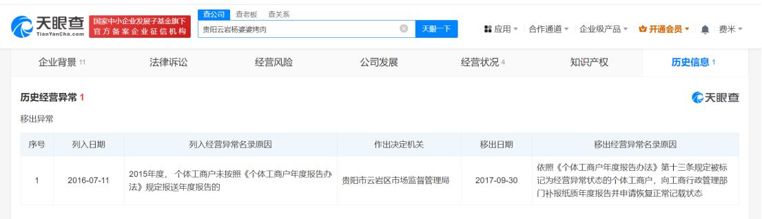 天眼查App显示,涉事店铺贵阳云岩杨婆婆烤肉成立于2011年11月,为个体工商户,经营者为张某,经营范围为烤肉。年报信息显示,该烤肉店从业人数为22人。风险信息显示,该烤肉店曾因未按照规定报送2015年年报,于2016年7月被当地市监局列入经营异常名录,后于2017年9月被移出。