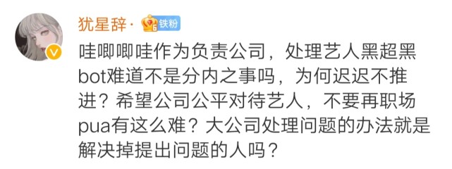 对于哇唧唧哇的不妥,一个叫“犹星辞”的网友愤怒地说道:“哇唧唧哇作为负责公司,处理艺人黑超黑bot难道不是分内之事吗,为何迟迟不推进?希望公司公平对待艺人,不要再职场pua有这么难?大公司处理问题的办法就是解决掉提出问题的人吗?”