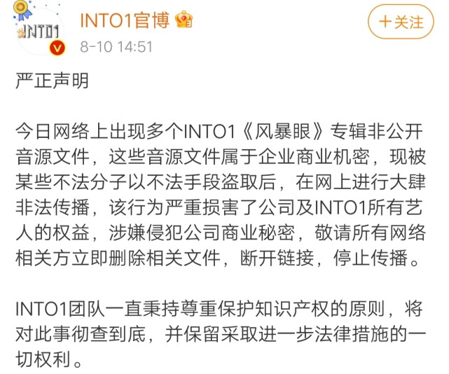 终于,几个小时后,INT01官博发声了,表示会彻查此事,还希望所有网络删除相关的盗版文件,断开链接,停止传播。