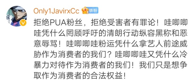 还有网友提出抗议:“拒绝PUA粉丝,拒绝受害者有罪论!哇唧唧哇凭什么罔顾呼吁的清朗行动纵容黑称和恶意辱骂!哇唧唧哇粉运凭什么拿艺人前途威胁作为消费者的我们?哇唧唧哇又凭什么冷暴力对待作为消费者的我们!我们只是想争取作为消费者的合法权益!”