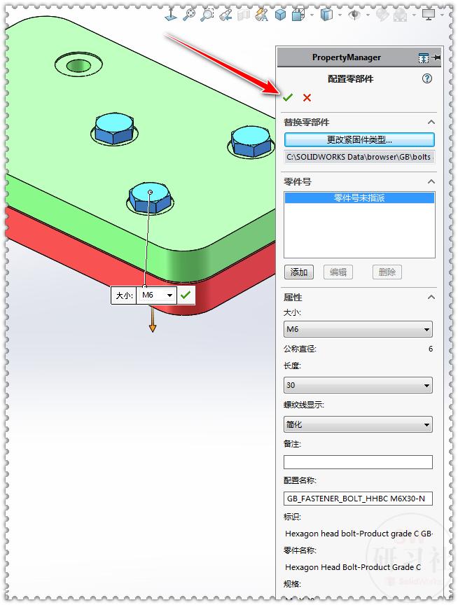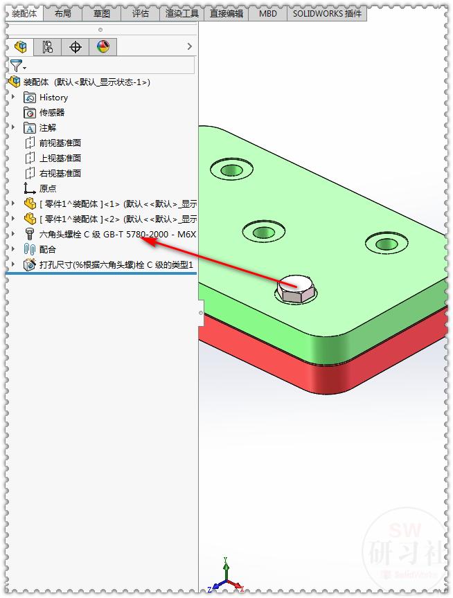 6.【设计库】-【Toolbox】-【GB】-【六角头螺栓】C级 GB/T5780-000,拖到孔上。