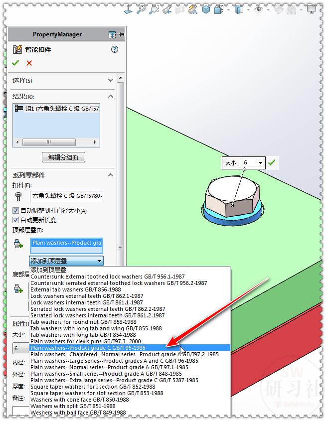 16-1.【添加到顶层叠】选择:GB/T95-1985的垫片。